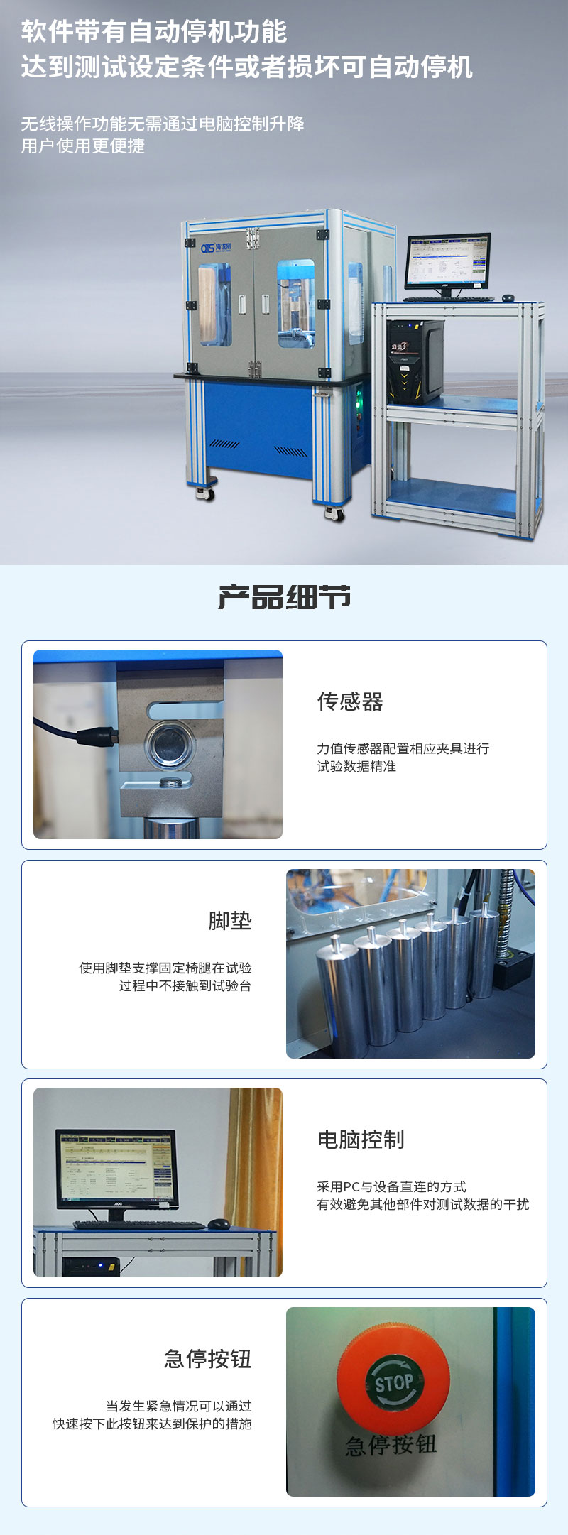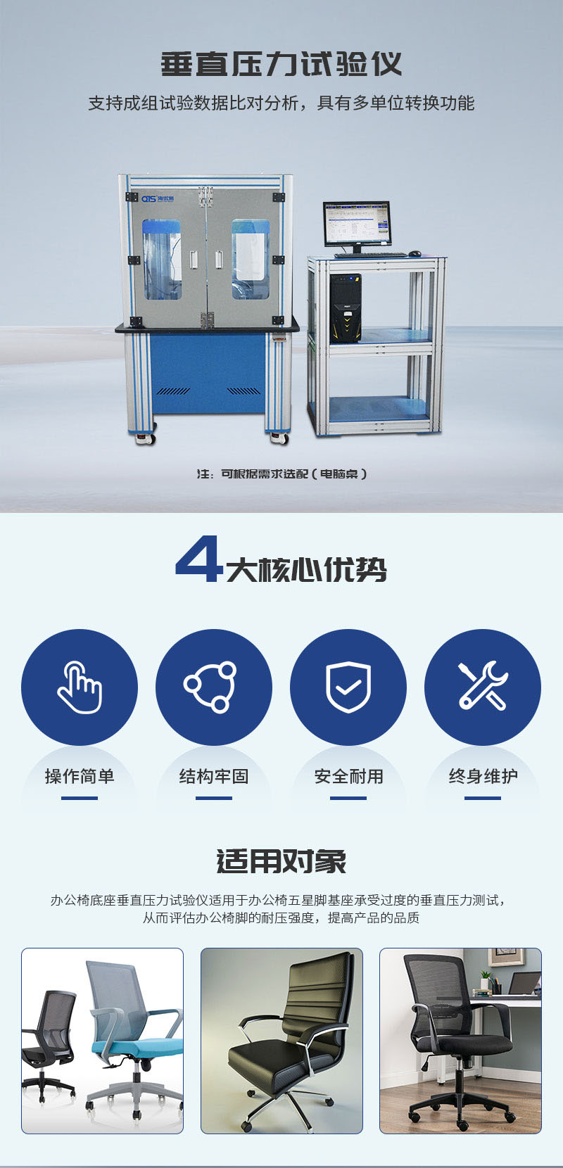 办公椅垂直压力试验机F733-2也叫“五脚静压试验机”,用于办公椅五爪抗压垂直压力测试,本机也可作为疲劳测试使用,在设定力值,测试周期内,反复加载压力作为疲劳测试。压力大小,持压时间和循环测试次数均可调。
