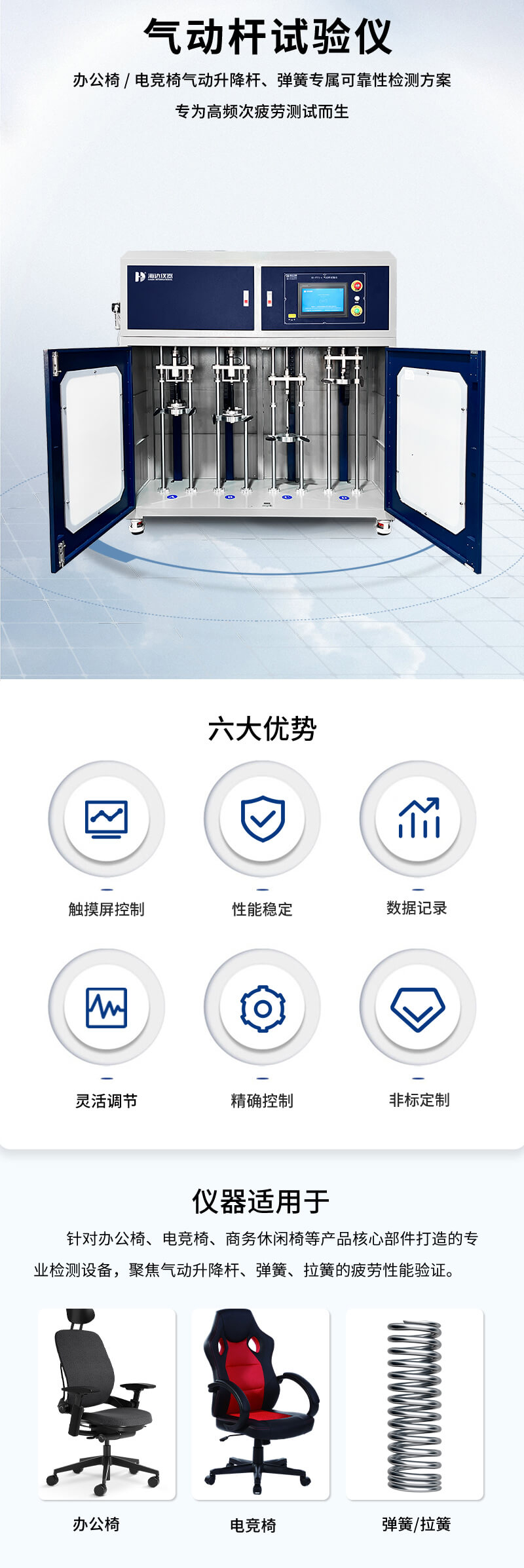 气动杆试验仪适用于办公椅、电竞椅、商务休闲椅等产品的气动升降杆、弹簧、拉簧的疲劳试验;设定一定的测试条件,以一定的频率进行疲劳试验(40000次)。