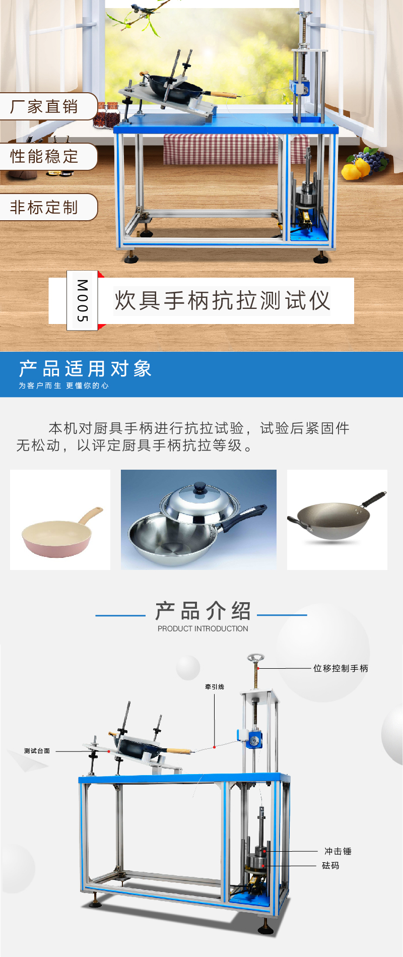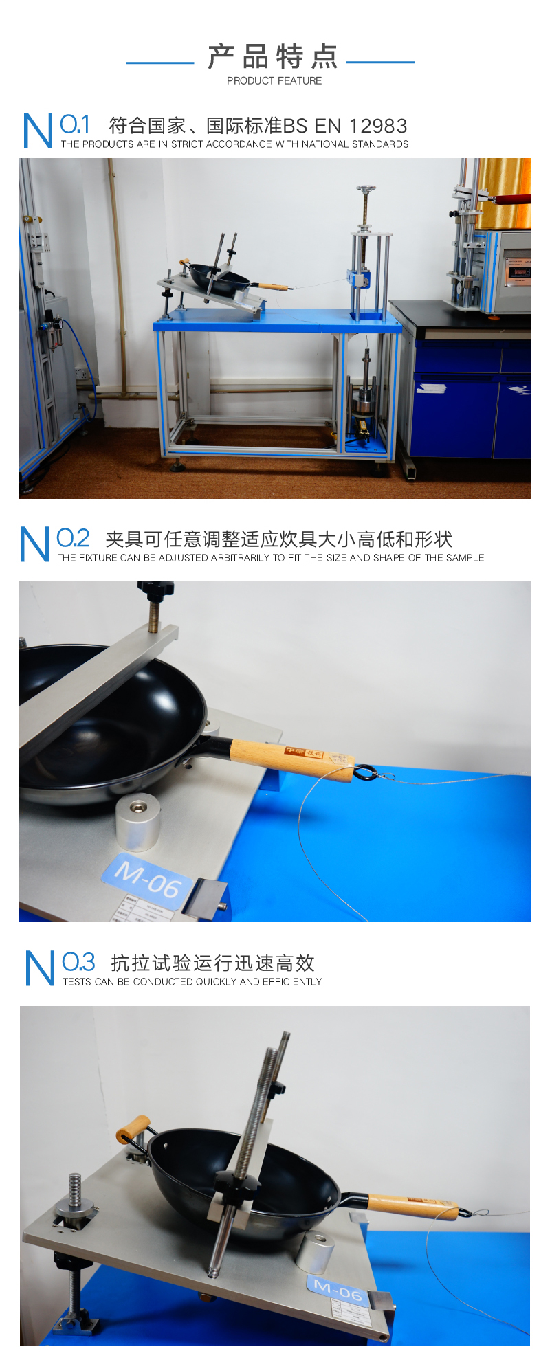 炊具手柄抗拉测试对厨具手柄进行抗拉试验,试验后紧固件无松动, 以评定厨具手柄抗拉等级。