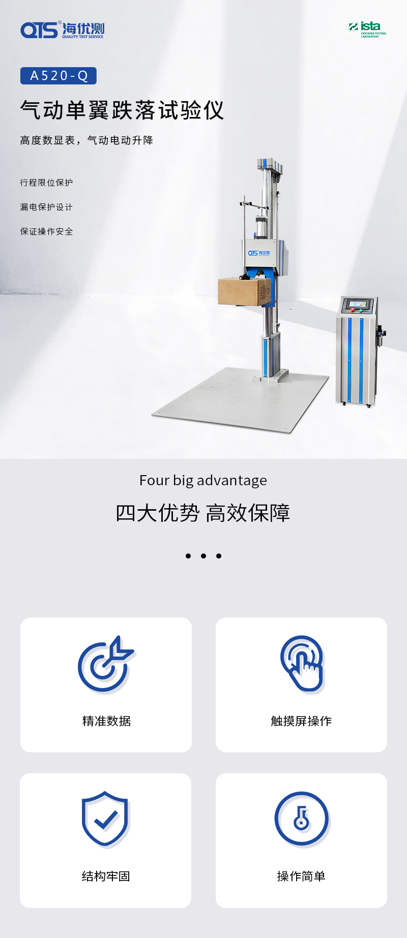 1.触摸屏+PLC控制,可设置测试高度和跌落次数等数据