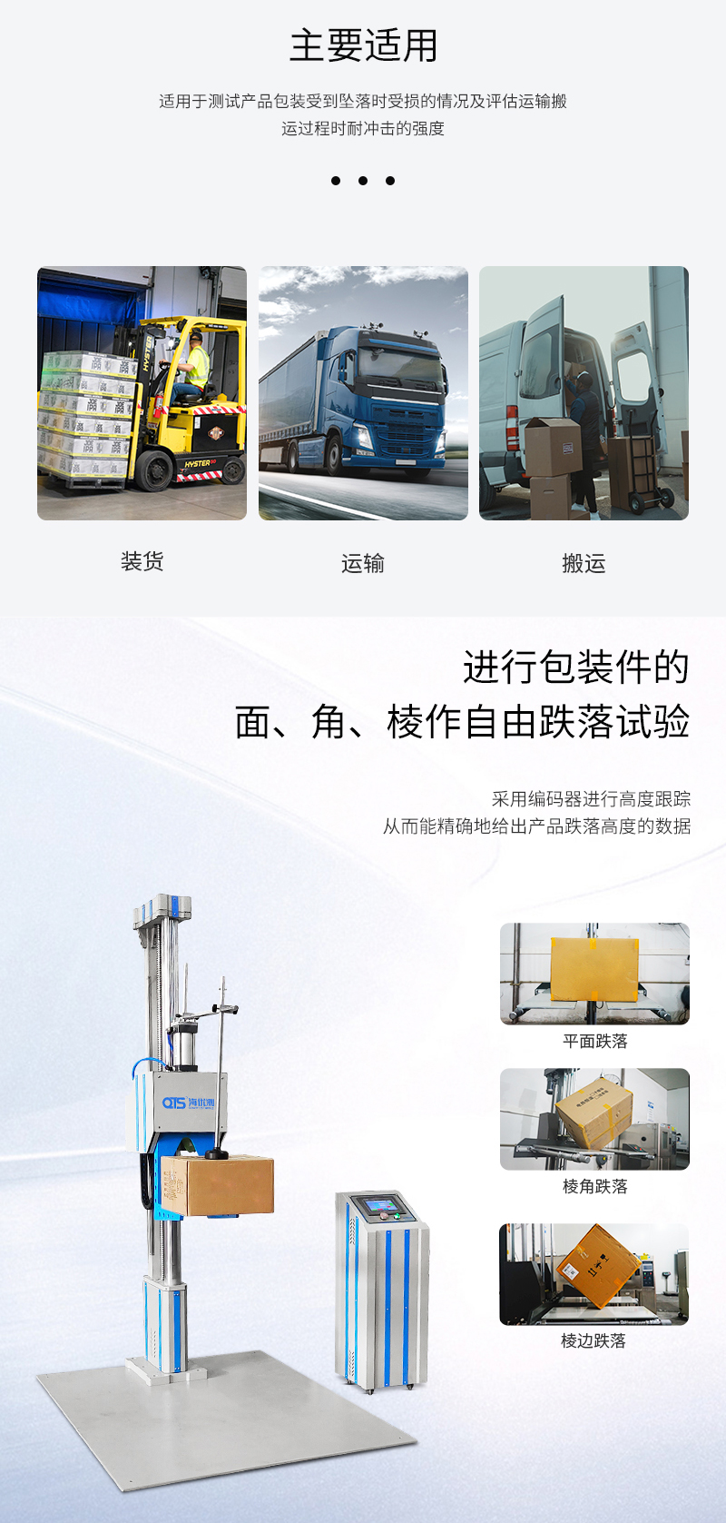 本测试仪可对包装件的面、角、棱作自由跌落试验,配备数显高度显示仪及采用编码器进行高度跟踪,从而能精确地给出产品跌落高度的数据。