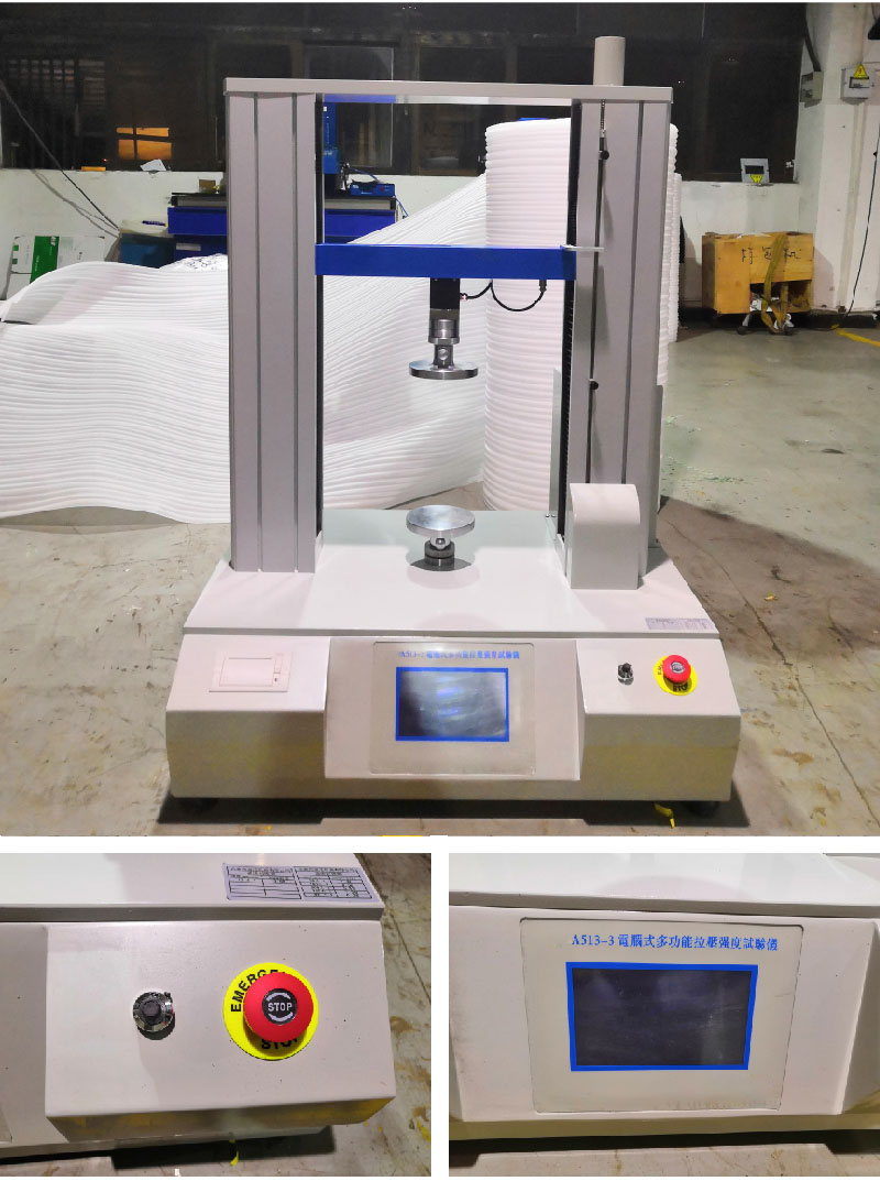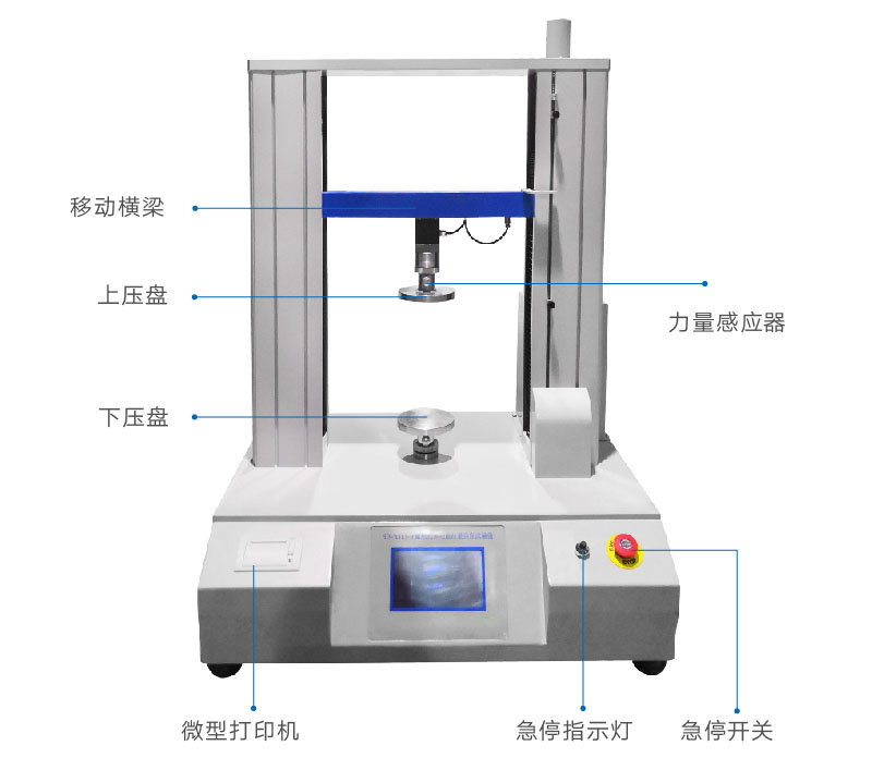 纸护角测试仪:将装置好试样试验夹具置於上下两轴板之间,然后施予规定之速度,上压板向下压缩试验时,上压盘上端的荷重元即感受到压力,并将压力转换成电压讯号输给显示器解析,同时压力值显示于力量显示屏上。