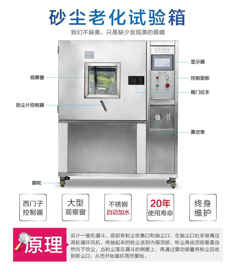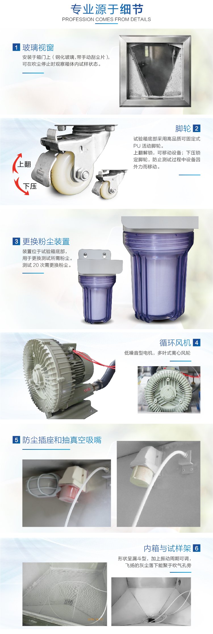 适用于检测产品的外壳密封性能,主要用于外壳防护等级标准中规定的IP5X和IP6X两个等级的试验。主要是模拟沙尘暴天气对锁具、汽摩零部件、密封件、电力仪表等产品所造成的破坏。