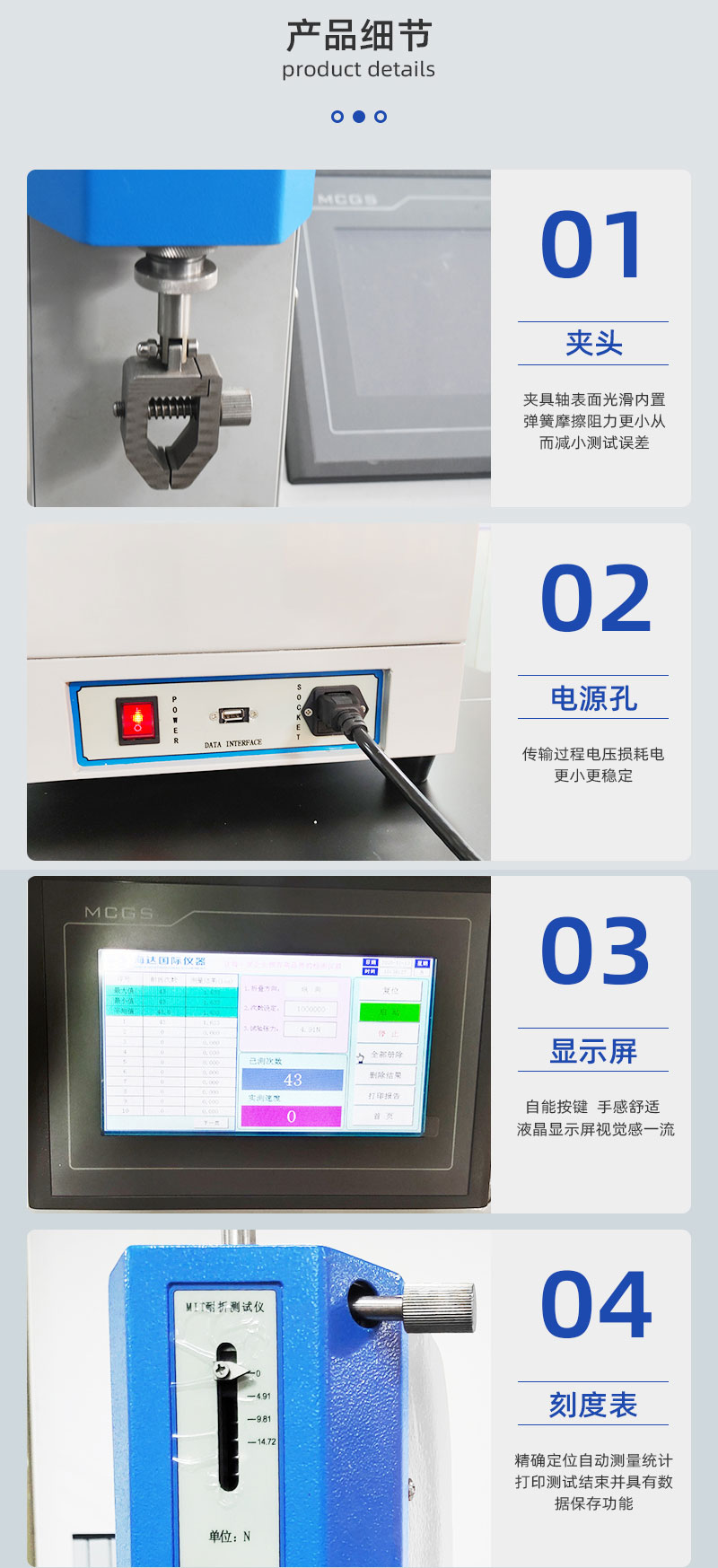 本机用于检测纸及纸板之耐折强度,试法是将试片两端固定于机上,下夹具施与所须之荷重,使试片承受一定之张力,下夹具在试片垂直状态下向左右两边往复弯折试样,弯折角度为135度,直到折断试片,并自动计数。