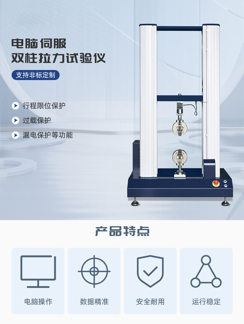 脑伺服式多功能拉力试验机适用于各种材料、半成品及成品,主要测试其抗拉强度、抗压强度及伸长量,可做拉伸、剥离、撕裂、热封、抗弯、抗折、压缩、 粘合等性能测试