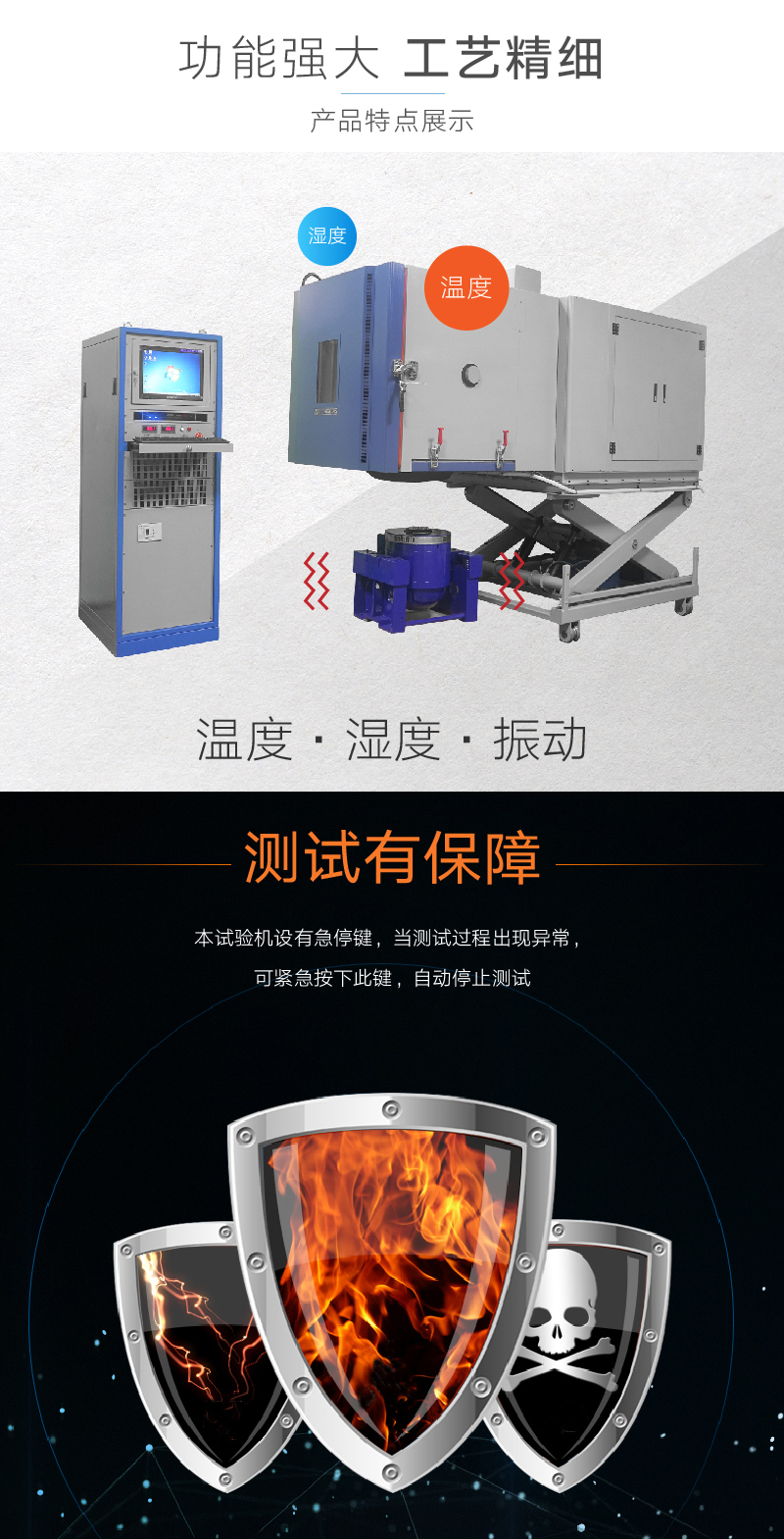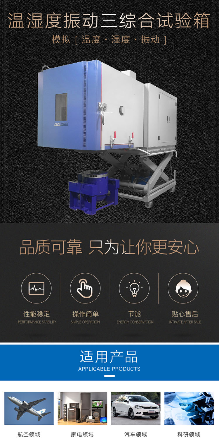 温湿度三综合振动台E809是集温度、湿度、振动综合应力试验系统(三综合试验箱),将温度、湿度气候应力试验与振动等力学应力试验集成一体。试验系统工作时,将(高温或低温,温度变化)应力、 温度应力、振动应力以及电应力按规定的组合方式和周期性空间,同时或分别施加到样品上,与单一应力作用相比,具有环境模拟更真实、试验效率更高等优点,现已广泛应用于航空航天、船舶、汽车等电子产品对环境适应性,使用可靠性的考核与评定,应用于电子产品设计缺陷的早期发现及工艺缺陷的筛选场合。